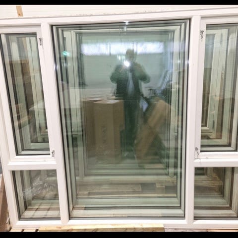2 nye 3 lags kombi vindu 1 fast felt og 1 åpnings felt type Spilka, Trevindu som er belagt med aluminium utvendig farge grå RAL 7024. 2 stk. Bredde 1.69 x ,1,69, selges kr 6000,- pr. Stk.