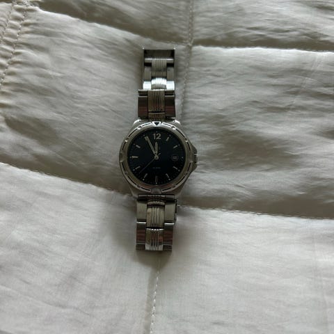 Vintage Orient klokke til dame, ca. 15 år gammel. Elegant, liten stål med gull i midten av lenken. Akkurat vært på service hos urmaker, nytt batteri og pusset.