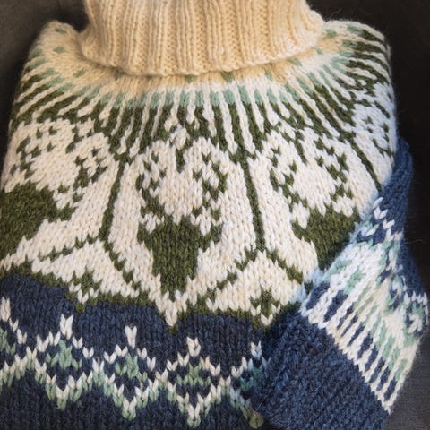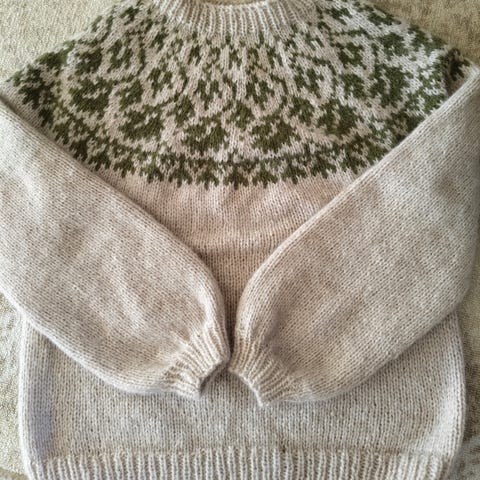Strikket genser i størrelse small, med mønsteret Sjón klar for salg. Strikket i islandsk ull, álafosslopi, som er varm og svært slitesterk.