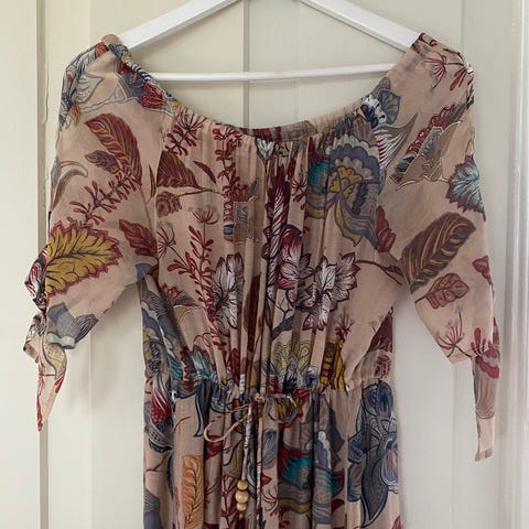 Utrolig behagelig ankellang kjole. Kun brukt en gang i bryllup, da med et belte i livet. Har noe åpen rygg med knytting og ellers fine detaljer rundt toppen av kjolen.
