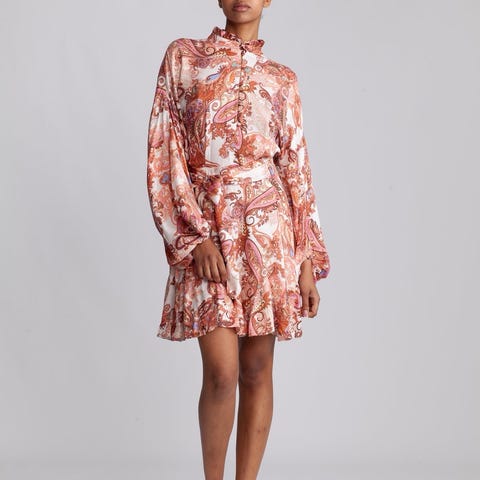Nydelig blomstret kjole med stoffknapper på rygg samt glidelås i soden.