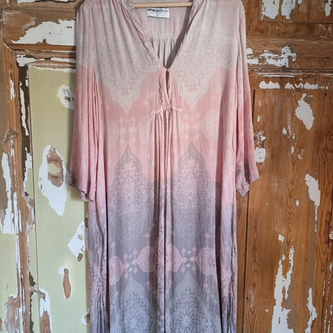 Rosa, grå, offwhite kaftan. Dette er en vareprøve så den er ikke mersket med størrelse, men tilsvarer nok ca en M eller S siden den er litt trang i foret nede. Oppe er den feleksibel så man kan evt lage en liten splitt nede hvis man er en større størrelse.