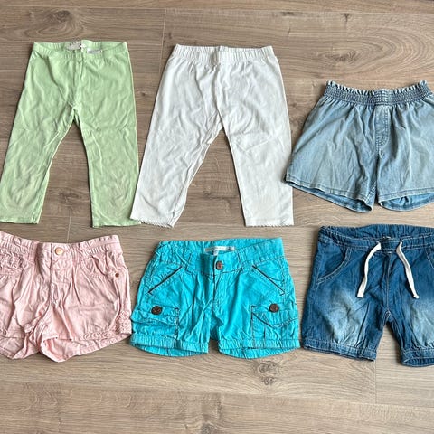 Rumper str. 68, gul og regnbue shorts str. 62, resterende shortser str. 68.