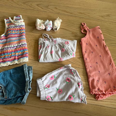 Selger pent brukt tøy til jente. Det er ingen huller i dem, men noen av plaggene har flekker eller er missfarget, se tekst til bilde for str og anmerkninger.