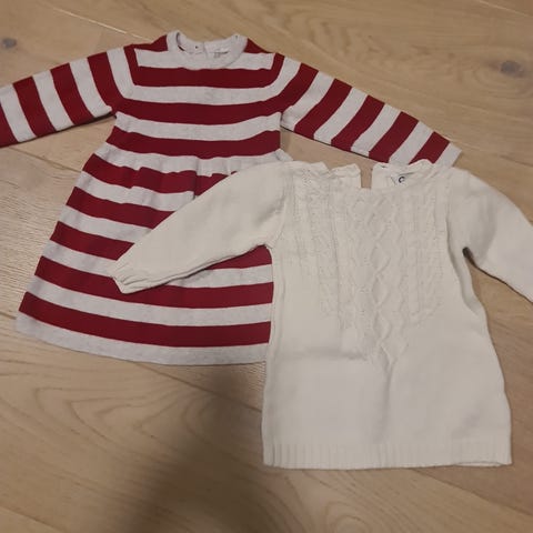 Selger også nydelig hjemmestrikket kjole.