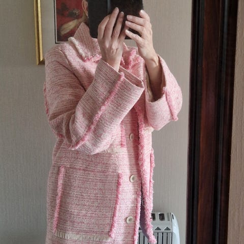 Rosa ny kort jakke i sånn stoff som du ser på bildet. Jakken er helt ny, den er hvit og rosa. Veldig inn nå med sånne jakker har jeg sett hos mine ungdomsskole elever, men aner ikke hva stoffet heter... Denne falt ikke helt i smak hos min datter, så da går den på finn.