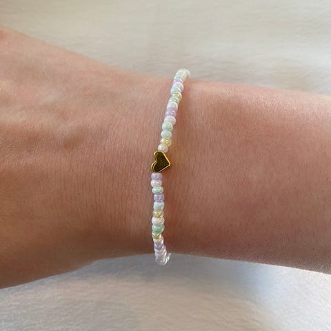 Armbånd av glasskuler og annet materiale med lås.