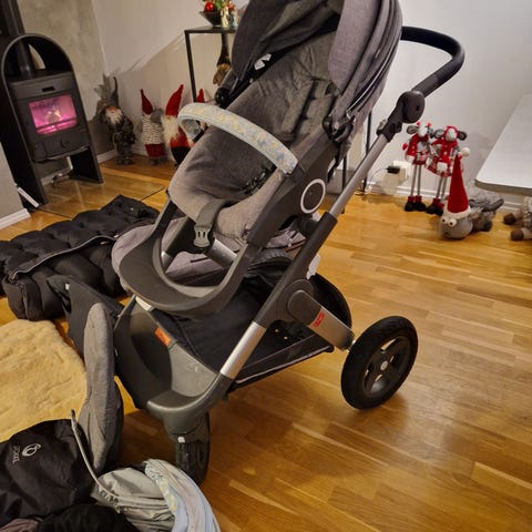 Brukt til 1 barn. Barnevogn Trailz fra Stokke. Inkludert underdel, sittedel, liggedel, myggnett og koppholder. Utgående modell, perfekt til norske forhold.