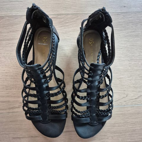 Spenner i metall (gull) og glidelås bak. Sitter pent og meget behagelig på foten.