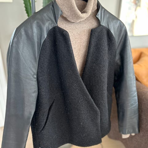 En grå skinnjakke i nydelig mykt skinn, kr. 400,-. Ser ubrukt ut og er minst i sin størrelse.