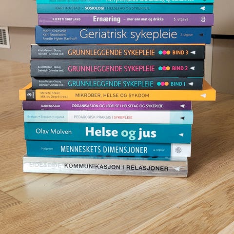 De fleste bøkene ble kjøpt nye da jeg startet på sykepleien i 2020. Årstallene som er oppgis i parantes er fra aktuell utgave.