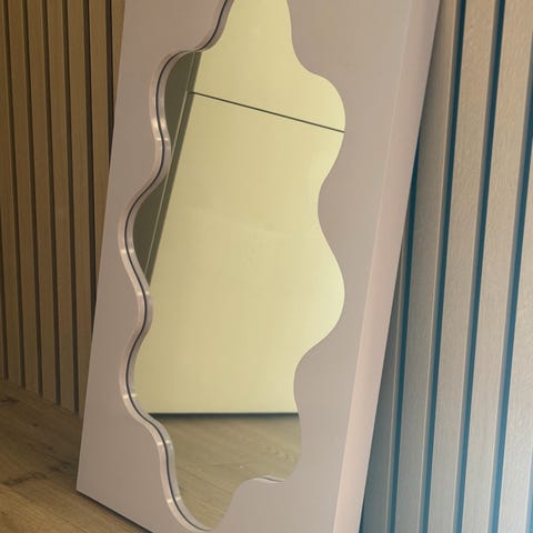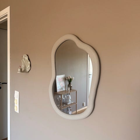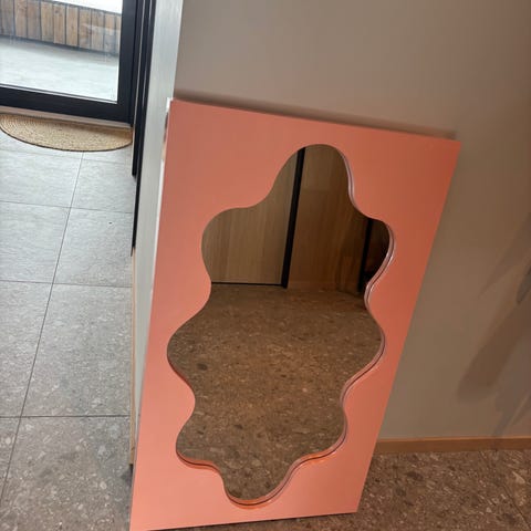 Øverst i venstre hjørne har speilet fått seg et hakk, vises ikke når det henger på vegg.