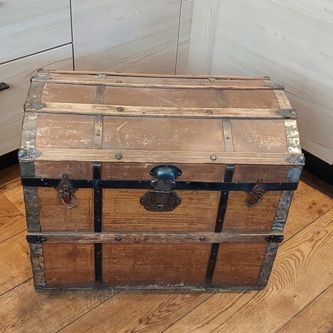 Kiste fra 1865 selges. Kisten er i god stand og er fint dekorert. Kan brukes som pyntegjenstand og til oppbevaring.