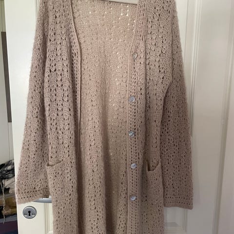 Lang jakke i dansk design, Q by Kjederqvist. Størrelse : large. Deilig myk kvalitet : 60% mohair, 20% ull, 20% polyamid. Jakken har heklet struktur og er i svak lyngfarge.
