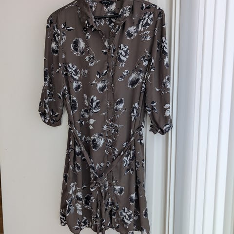 Kortermet lang kjole som kan bukse både med og uten belte.
