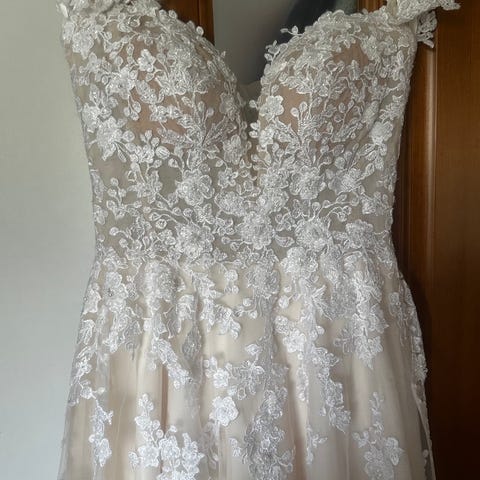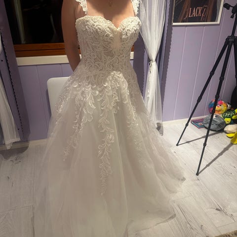 Anna Sposa Brilanta kjolen ble kjøpt ny i 2019 og brukt en gang i noen timer. Fargen er melkehvit, den har splitt (10cm) og lommer. Passer for høyde 160 + 10 cm hæler. Kjolen er renset etter bryllupet og oppbevart hengende i kjolebag. Kjolen opprinelig kjøpt for 9000 med skredder.