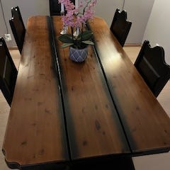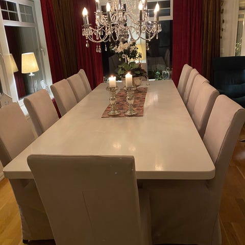 Spisebord fra ikea og 6 stk hvite stoler fra jysk selges for 4000kr. Spisebordet kan trekkes ut slik at den blir lengere.