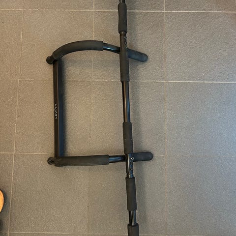 Selger en portable hang-up bar som man kan montere hjemme og ha med på reise.