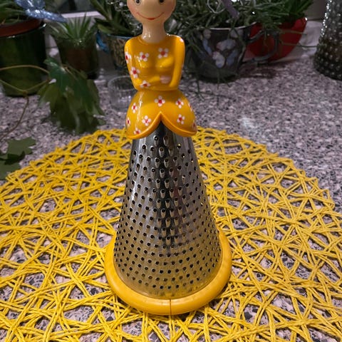 Artig grønnsakrasp til salgs. Skjørtet til damen er en brukbar rasp. Jeg har kun brukt raspedamen som pynt. Jeg tror det er vanskelig å få tak i slike nå.
