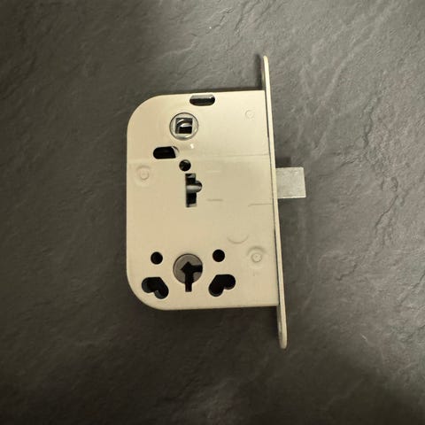 Ikkje-flyttbar triggerbolt gjer at kassa berre vil passe ved installasjon på høgrehengsla dør. Låsen er elles ut av pakken og seljast då eg har fått ny frå Yale.