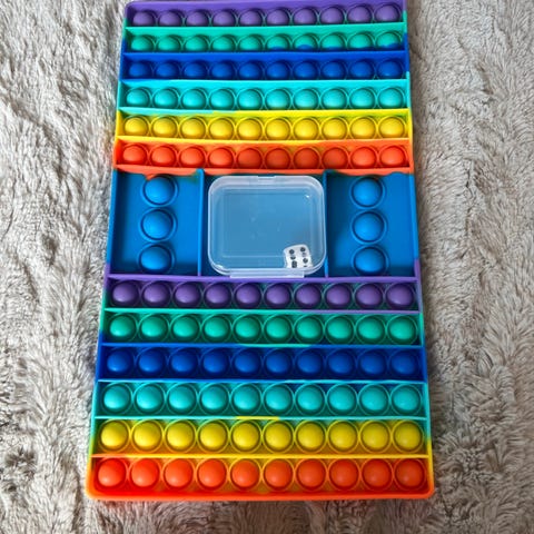 Et gøy pop it spill, 2 spillere/lag, ink terninger. man kaster terningene sammen, den ene terningen er i farger og de to andre er tall. Den fargen terningen lander på skal du ta vekk så mange som de to andre terningene viser.