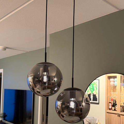 Selger en Ball taklampe fra Nova Life i fargen Matt Brass light smoke. Munnblåst kule i glass, opphenget er i messing. Usikker på om denne er å få tak i lenger. Kjøpt på Lampehuset for et par år siden.