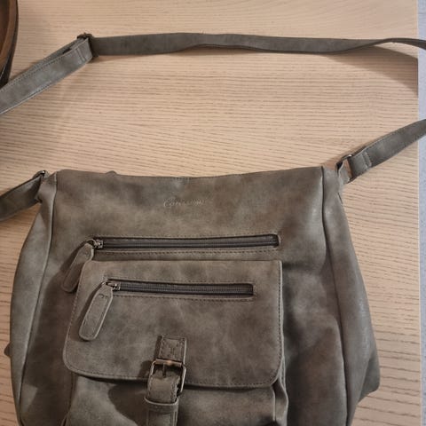 Farge beige, to ulike nyanser. Bred veskestropp med grønne detaljer. Kan sendes mot at mottaker betaler porto. Ingen pruting på pris, selges ca 400 kr billigere enn nypris.