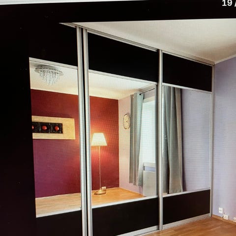 Fine dører fra Rival selges da rommet skal endre bruksområde. Med alle dører dekker den opptil 575cm, har man litt kortere vegg blir det bare mer overlapp mellom hver dør. Har vært montert på 290cm takhøyde med liten list i toppen, er det høyere lager man bare en større foring/list i topp. Laveste mulige takhøyde er 281cm. Skinner i bunn og topp medfølger som avbildet.