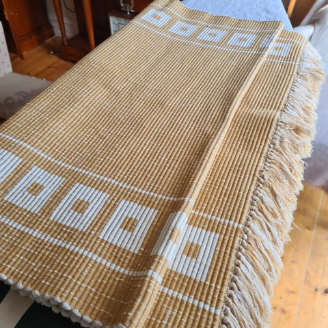 Helseteppe i bomull, str. ca 65×90 cm. Pent brukt og uten flekker eller hull. Teppet er i en pen lakserosa farge. Mykt og luftig helseteppe i 100 % økologisk bomull.