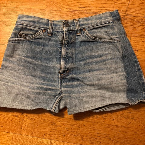 Jeans fra 1980-tallet! Dette ser ut til å være typen; oransje-Levis! Merkene er klippet av så vet ikke størrelsen er liten og med litt høyt liv. Lengde ben er nok 32" (passer til høyde 160-175cm). Mål; livet (fra ene siden til andre) er ca 32/33 cm og fra skrittet og opp til linningen er ca 27 cm.
