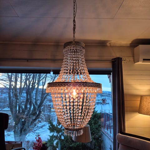 Antikk taklampe som er helt i orden slik den var som ny. Den gir et varmt og behagelig lys pga det varme og vakre glasset. Kuppel og oppheng er i glass og stroppene er flettet stoff. Den har hengt på barnerommet siden 1957 og aldri vært tatt ned. Nå selger vi denne fordi barna ønsker en mer moderne versjon:-). Flott om lampen kan hentes men vi kan sende og kjøper betaler frakt. mvh GA