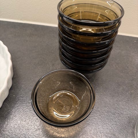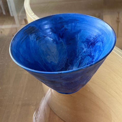 2 pene glass skåler med mønster i blått, gull og litt rosa. Håndmalte, laget i Spania.
