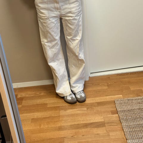 Litt rynkete i buksebeina, men vil nok enkelt kunne bli fin igjen etter damp eller vask.