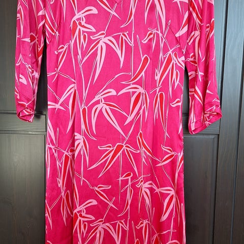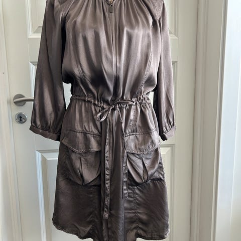 Fin kjole i elastisk stoff med slangemønster, lengde fra nakken og ned 75 cm, tynn i stoffet. Gråblå/brun, sortaktig i fargen. Fine fargekombinasjoner.