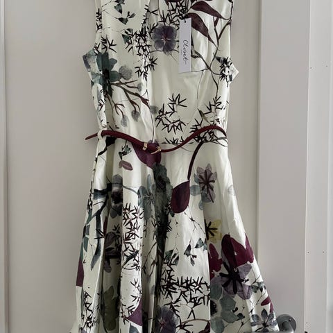 Ubrukt blomstrete kjole med, glidelås i sida, lett underkjole og svart belte. Str. S.