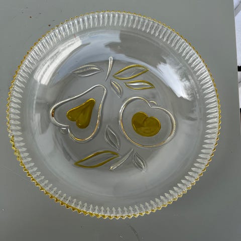 Bolle og fat i lyseblått glass fra 50 tallet. Det er en gul håndmalt rose på begge. Rosen er litt slitt. Ellers et flott sett. Se ellers bilder for visuell beskrivelse og mål. Selges 250 kr for begge.