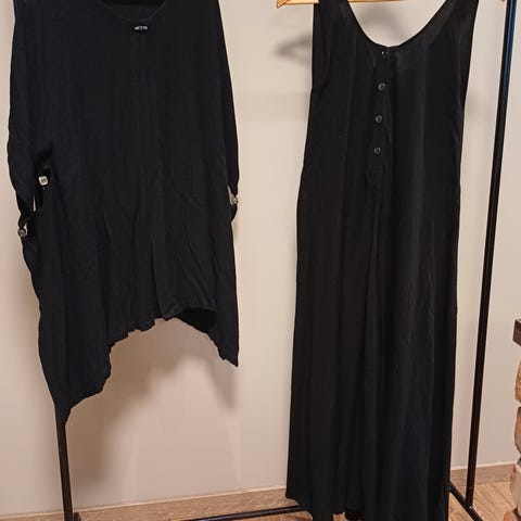 Sett med bukse og overdel med drapering. Sort glitterstoff. Lommer og strikk i livet på buksa. Drapering på leggen. Deilig stretch stoff. Str L.