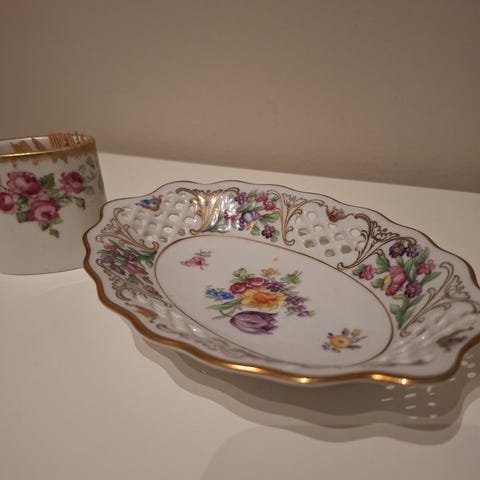 En kaffekanne og en tekanne, begge fra engelske Crown Ducal (produserte fra 1915, kjøpt opp av Wedgewood på 70-tallet. Bristol-serviset er visstnok fra rundt 1920-tallet).