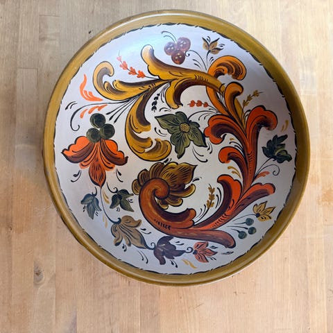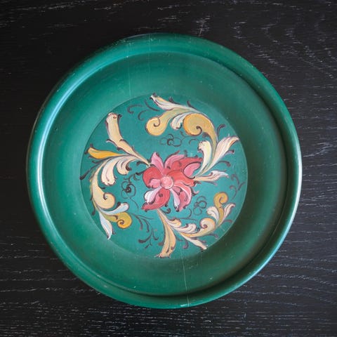 Nydelig liten skål med pent malt emalje både på utsiden og inni. Fin stand, men har en skade på emaljen på ene siden (se bilde), prisen er satt deretter. Kjempefin å bruke til feks malekoster/sminkekoster eller til smykker på badet eller soverommet. Pene klare farger og nydelig håndmalt motiv.
