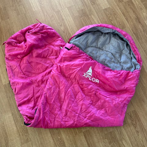 Rosa barnesekk med sovepose, telt ca 1,50 x 1,10, vannflaske, kompass og hov. Aldri vært brukt. Soveposen er i polyester ca. 1.45 lang og ca. 70 cm bred. Glidelås helt rundt, kan brukes som teppe også. Sekken har stor frontlommer og nettinglommer på hver side.