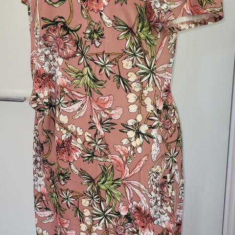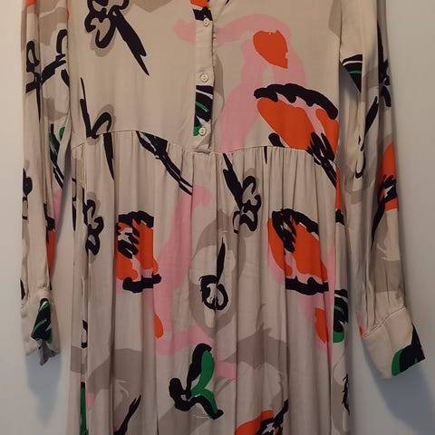 Fin kjole i 100% viskose, flotte varme farger, langt skjørt med vidde, belte på kjolen og knapper helt ned. Lengde fra nakke ca 130 cm. Liten i st. tilsvarer mer st 36.