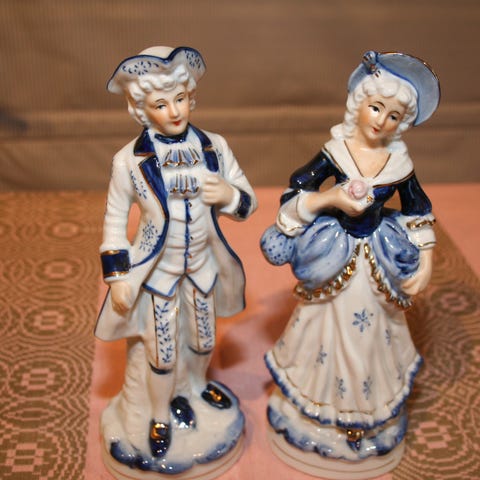 2 figurer i porselen, Mann med ukulele og Dame med liten harpe, selges