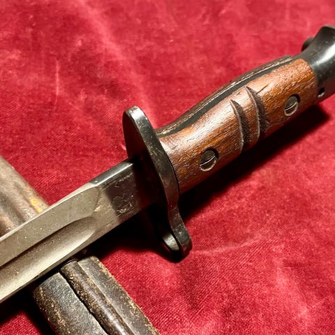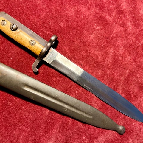 Mauser bajonett.Veldig bra replika. Kan slippes. Brukt i rekonstruksjoner av krig/kamp.