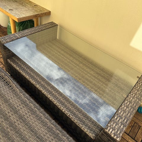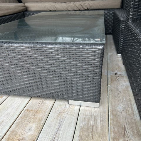Selger tre glassplater til utemøbler. De er ikke brukt, er pakket inn i bobleplast og papp. Bildet er av glassplata på mitt eget utemøbel.