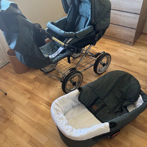 Emmaljunge barnevogn med bag og sportsdel selges samlet. Sportsdel ikke brukt da vi gikk over til enklere vogn. Gode terreng/vinterhjul. Enkel å slå sammen. Brukt kun av 1 barn fra røyke og dyrefritt hjem.