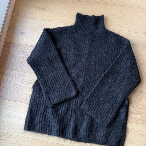 En genser i myk, ribbestrikket ull med polokrage og ekstra lange, vide raglanermer. Loose fit. 100% ull. Pris i butikk 599 kr. Ny