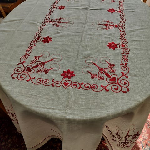 Duk. Ikke brukt. Kraftig stoff. Lengde 220cm. Bredde 140cm. Bruker tilsvarende spesielt til jul/påske.