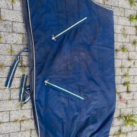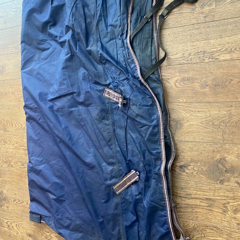 Lite og pent brukt dekken. Str 145. Mørk blå med hvit kant, tynt for og glatt innside. Fester til beinstropper.