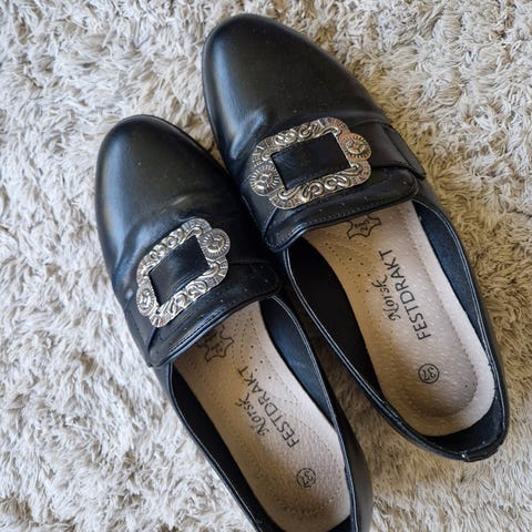 Tøflene forfra. Den ene skoen (til høyre) har noen merker på tåen - etter krabbing