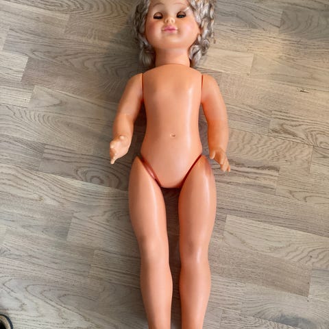 Gammel sovedukke trolig fylt med halm og med brokadekjole.
